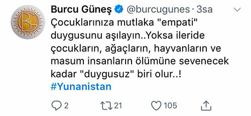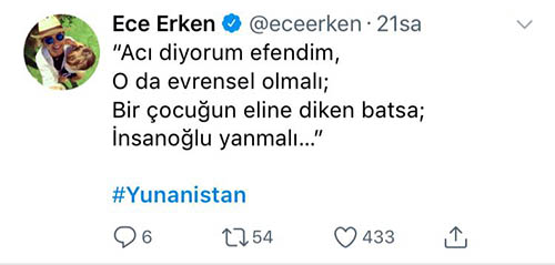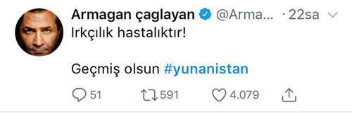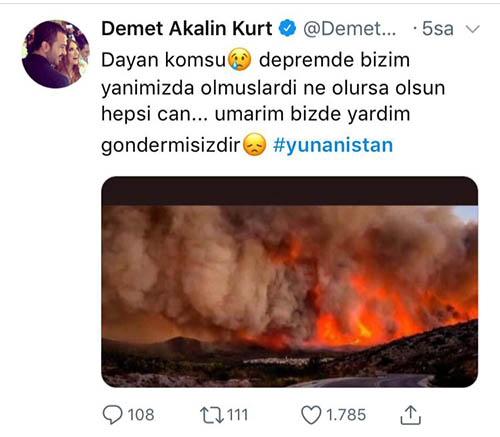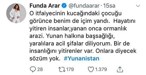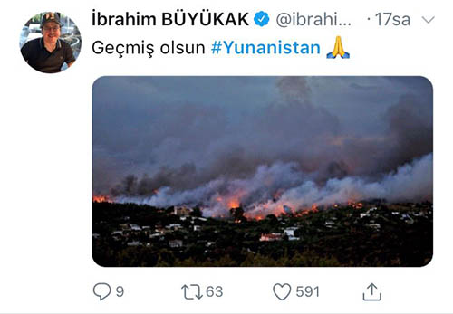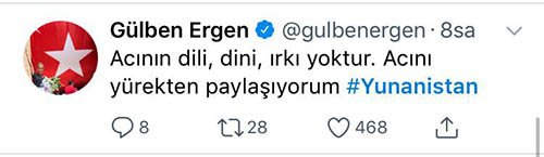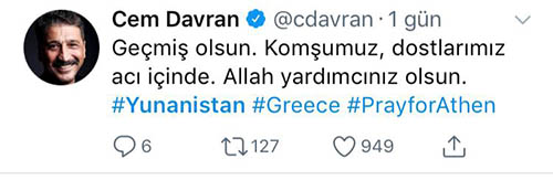 ''Başın sağolsun Yunanistan, acın tüm insanlığın yüreğini yakıyor... En çok da, yanı başında olan insanların... Hayatını kaybeden kardeşlerimizin anısına saygıyla...''