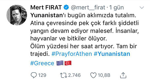 "Atina'da yaşanan trajik orman yangını haberlerini duymaktan dolayı çok üzgünüm. Bu yangından dolayı hayatını kaybeden ve zarar görenlere en içten başsağlığını ve tüm Yunan halkına dualarımı gönderiyorum. "