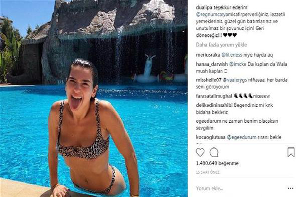 Ekibiyle birlikte otelin sahilinde yüzen ve yemek yiyen Dua Lipa, bu anlara ait fotoğraf ve görüntüleri de sosyal medya hesabından, "Misafirperverliğiniz, lezzetli yemekleriniz, güzel gün batımlarınız ve unutulmaz bir şovunuz için geri döneceğiz" notuyla paylaştı.