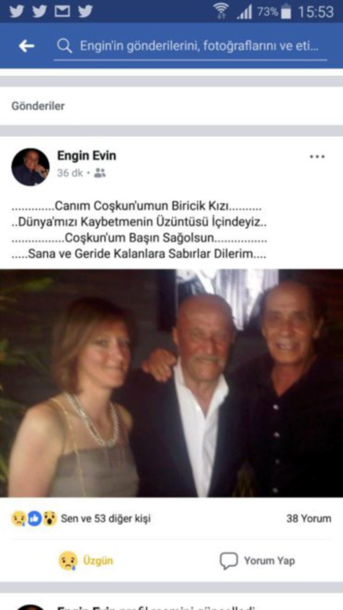 Engin Evin paylaşımında, “Canım Coşkun’umun biricik kızı Dünya’mızı kaybetmemizin üzüntüsü içindeyiz. Coşkun’um başın sağolsun, sana ve geride kalanlara sabırlar dilerim” ifadelerine yer verdi.