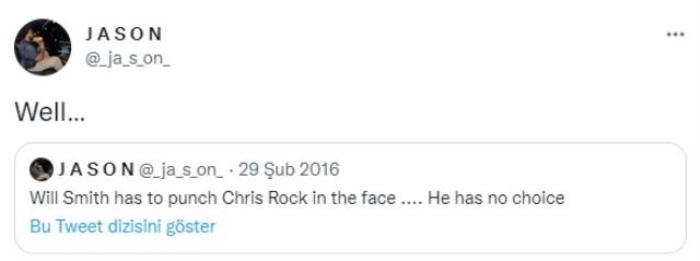 Jason adlı bir Twitter kullanıcısı, Will Smith'in Chris Rock'a tokat atacağını 2016 yılında attığı bir tweette ifade ettiği ortaya çıktı. Will Smith'in Oscar'da Chris Rock'a tokat atmasının ardından 6 yıl önceki tweet yeniden gündem oldu.