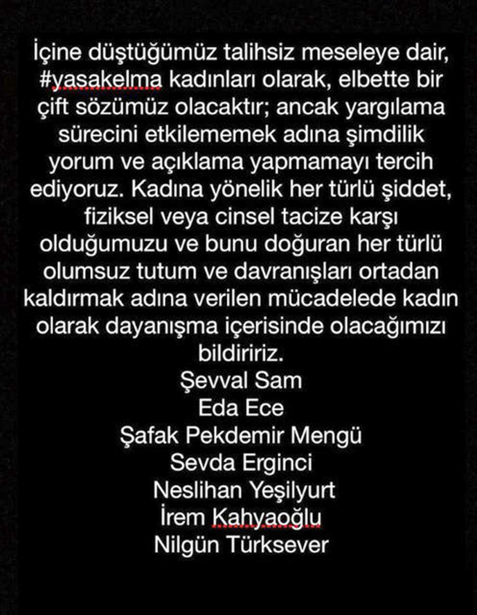 "İçine düştüğümüz talihsiz meseleye dair, #yasakelma kadınları olarak, elbette bir gift sözümüz olacaktır; ancak yargılama sürecini etkilememek adına şimdilik yorum ve açıklama yapmamayı tercih ediyoruz. Kadına yönelik her türlü şiddet, fiziksel veya cinsel tacize karşı olduğumuzu ve bunu doğuran her türlü olumsuz tutum ve davranışları ortadan kaldırmak adına verilen mücadelede kadın olarak dayanışma içerisinde olacağımızı bildiririz. Şevval Sam, Eda Ece, Şafak Pekdemir Mengü, Sevda Erginci, Neslihan Yeşilyurt, İrem Kahyaoğlu, Nilgün Türksever"