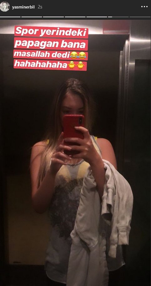 Babası Mehmet Ali Erbil’in sağlığının günden güne daha iyiye gitmesiyle birlikte gündelik hayatına geri dönen kızı Yasmin Erbil, sosyal medya hesabından keyifli paylaşımlarda bulunuyor. Kimi zaman arkadaşlarıyla çıktığı bir gezintiden paylaşım yapan Erbil kimi zaman da devam ettiği spor salonundan paylaşımlar yapıyor. Yaz aylarının gelmesiyle birlikte salona daha fazla gitmeye başlayan Yasmin Erbil burada başına gelen ve kendisini son derece mutlu eden bir olayı sosyal medya hesabından paylaştı. Spor salonundaki papağaının kendisine ‘Maşallah’ dediğini söyleyen Yasmin Erbil, hikaye kısmından yaptığı paylaşımlarda papağanın fotoğrafını paylaşmayı da ihmal etmedi.