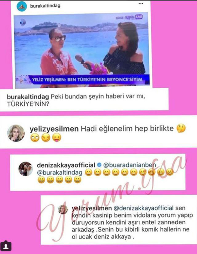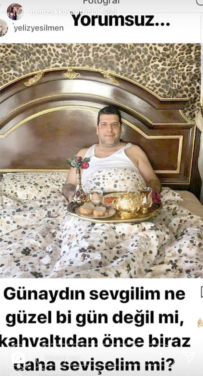 Asıl bomba paylaşım eski manken Deniz Akkaya'dan gelmişti. Deniz Akkaya, Yeliz Yeşilmen'in paylaştığı kahvaltı fotoğrafını kendi Instagram hesabının hikaye bölümünde yayınlamış, "Günaydın sevgilim ne güzel bir gün değil mi? Kahvaltıdan önce biraz daha sevişelim mi?" şeklinde şok bir yorumda bulunmuştu.