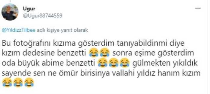 "Ünlü şarkıcının hayranlarından biri Tilbe'nin paylaşımın altına, "Bu fotoğrafını kızıma gösterdim tanıyabildin mi diye kızım dedesine benzetti. Sonra eşime gösterdim oda büyük abime benzetti. Gülmekten yıkıldık sayende sen ne ömür birisin ya vallahi Yıldız hanım kızım." yazdı.